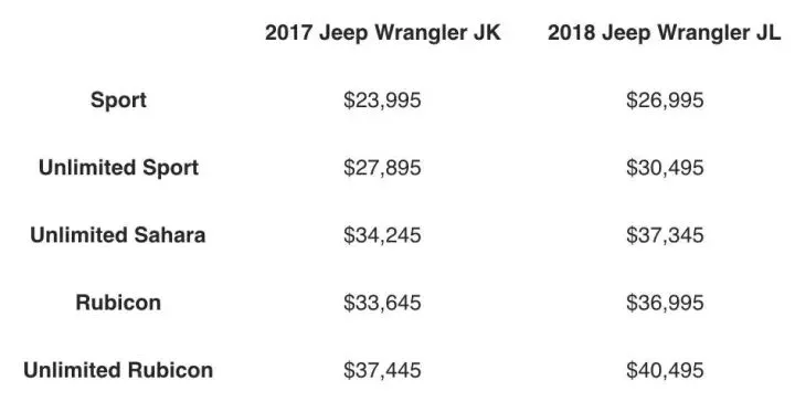 近日,JL海外售价曝光,基本运动款起价26995美元(约合人民币178634元)起售,比2017JK涨价3000美元;而双门牧马人JL Rubicon售价为36995美元。全部版本售价如下: