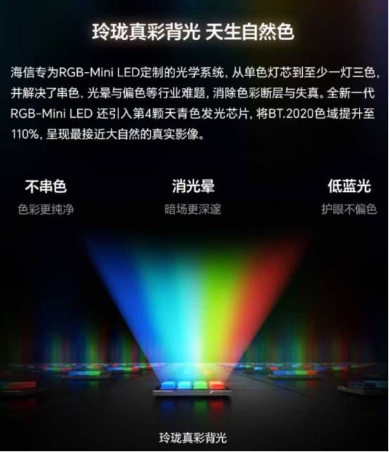 由海信开创的RGB-Mini LED技术,是全球公认的最新一代显示技术,实现了对光源的底层重构。它与SQD-Mini LED的背光方案完全不同,采用彩色背光直出,无需量子点作为中间介质,一举达到行业最高的110%BT.2020 色域覆盖,不仅实现了肉眼光晕无感的观看体验,更达成了稳定高亮、色彩真实、纯净、通透、绿色节能与健康护眼的完美平衡,彻底解决了传统技术的诸多痛点。可以说,QD-OLED、SQD-Mini LED等技术做不到的,RGB-Mini LED都做到了。