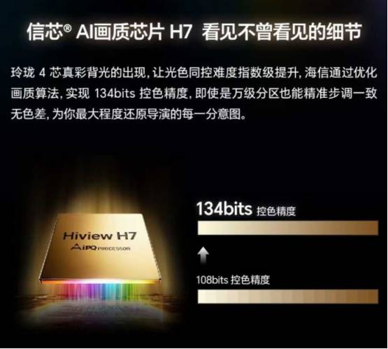 针对RGB技术对控色精度的指数级算力要求,海信开发了独立的信芯AI画质芯片H7,搭配光色同控算法,一举解决了控光控色的精度难题。